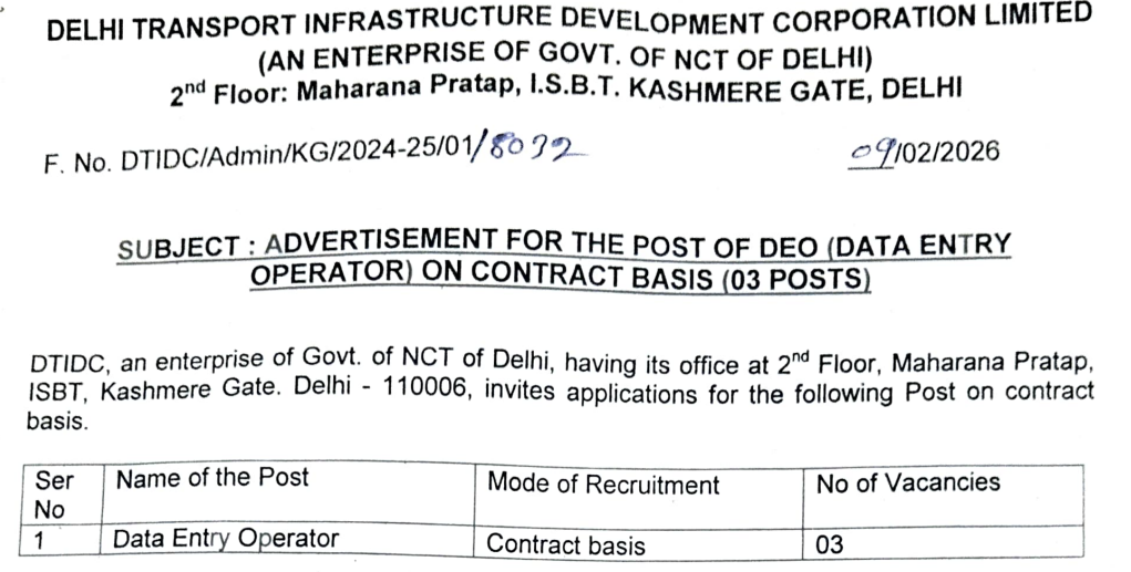 DTIDC Recruitment 2026: अगर आप दिल्ली में सरकारी नौकरी ढूंढ रहे हैं, तो यह नौकरी आपके लिए है। Delhi Transport Infrastructure Development Corporation (DTIDC) ने Data Entry Operator (DEO) के पदों पर भर्ती निकाली है। कुल 3 पद हैं और ये संविदा (कॉन्ट्रैक्ट) आधार पर भर्ती निकाली हैं। अगर आप ग्रेजुएट हैं और कंप्यूटर का अच्छा ज्ञान आपके पास हैं, तो यह आपके लिए इस नौकरी का बढ़िया अवसर है। इस भर्ती के ऑफलाइन फॉर्म 9 फरवरी 2026 से सुरू होकर 18 फरवरी 2026 के शाम 6 बजे तक भरे जाएंगे