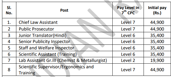 | Posts | Senior Publicity Inspector, Lab Assistant Gr. III, Chief Law Assistant, Junior Translator (Hindi), Staff and Welfare Inspector, Public Prosecutor, and Scientific Assistant (Training) |